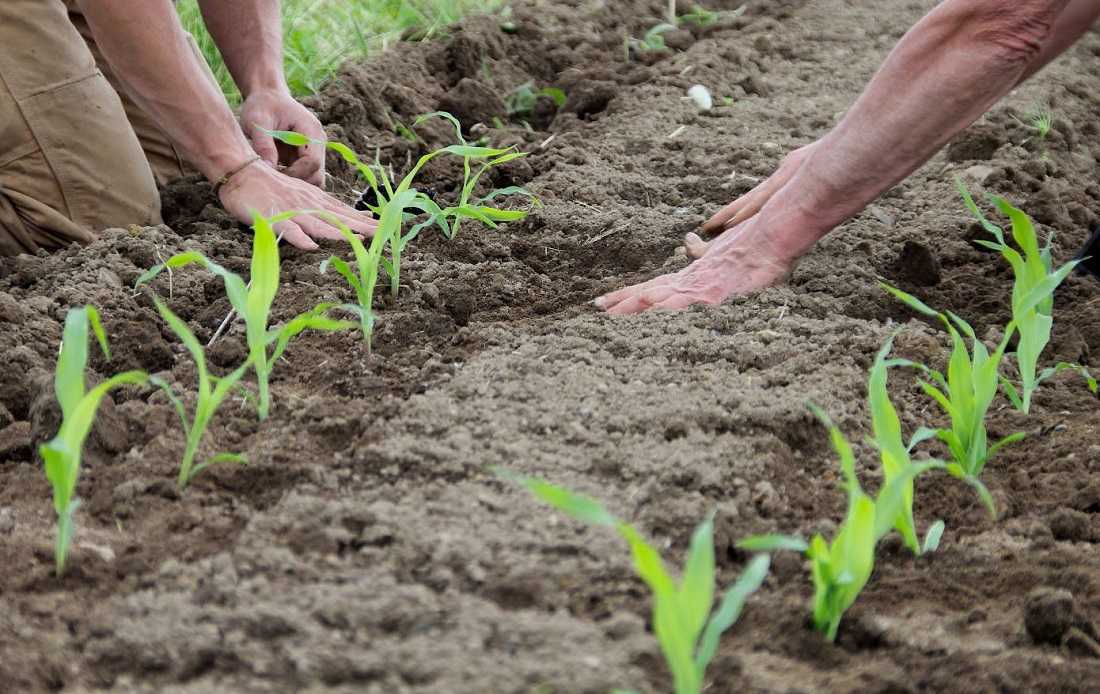 - Сделать лунки на расстоянии 30 сантиметров друг от друга, посеять по 2-3 семечка огурцов и столько же кукурузы. После всходов оставить по одному, самому сильному ростку.