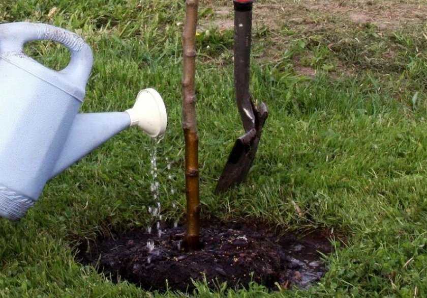 Сразу после посадки в яму вливают от 20 до 30 л воды. По мере впитывания жидкости, почва в лунке просядет. После полива нужно будет досыпать недостающую часть почвы.
