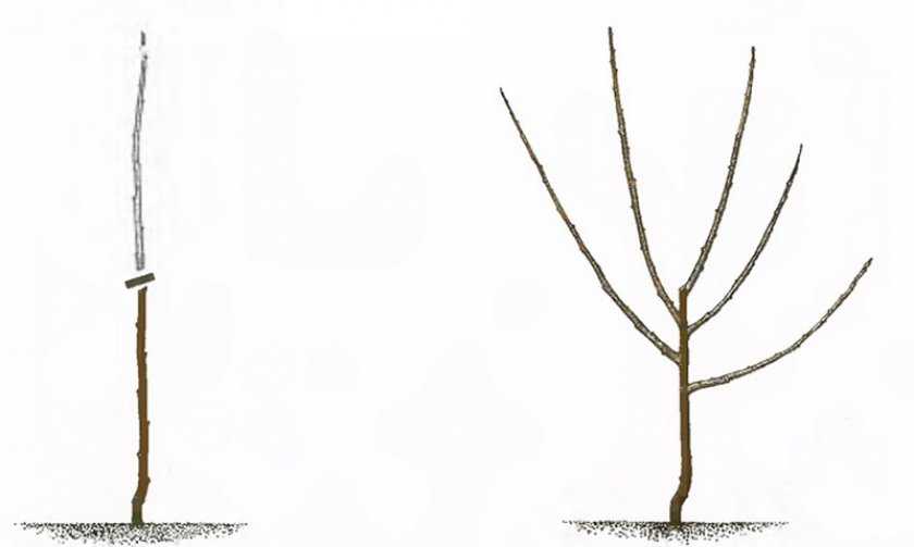 Сразу после посадки саженец яблони необходимо обрезать, чтобы уровнять корневую систему с надземной частью (это делается для своего рода «реанимации» саженца после посадки, т.к. любая посадка и пересадка – это травма и стресс для растения).