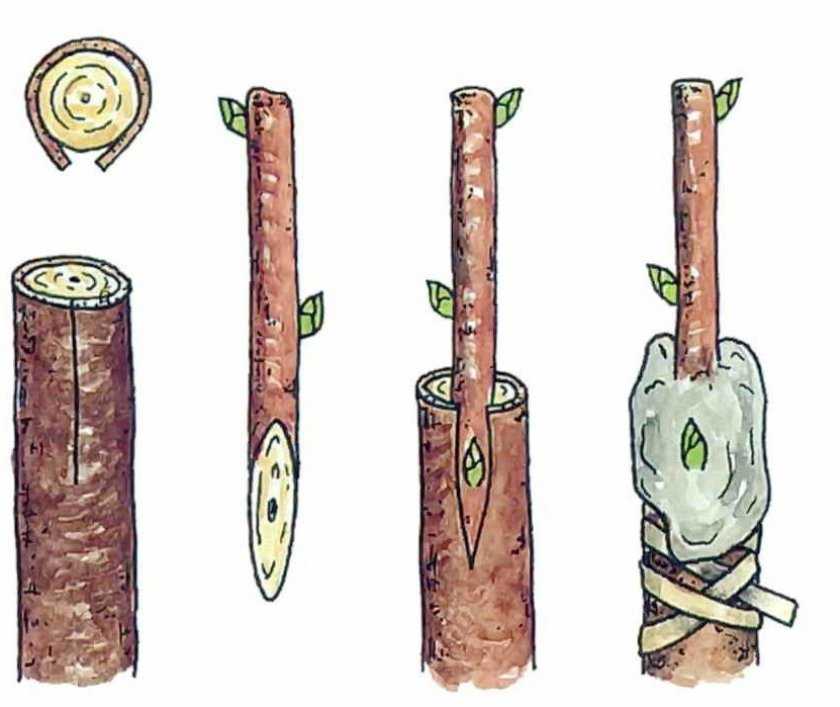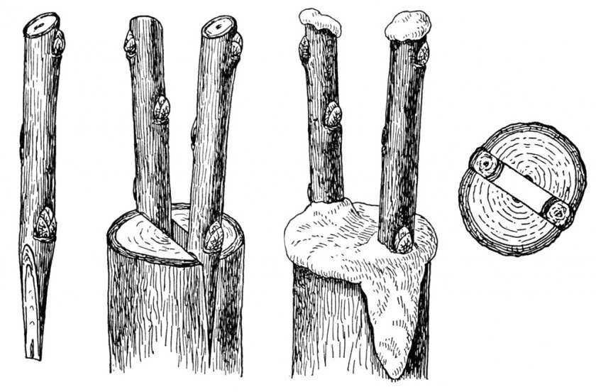 - В случае, если черенки для привоя по диаметру существенно меньше подвоя, в расщеп можно вставить несколько заострённых клинообразно черенков.