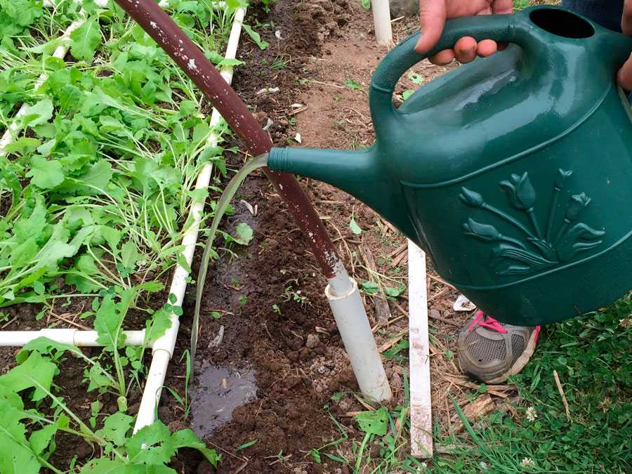 Полноценный урожай можно получить только при достаточном уровне влаги. Полив проводят 2–3 раза в неделю. Делают это с помощью лейки с мелким ситом: это не позволит струе навредить маленьким росточкам. На больших территориях используют шланг с рассеивателем. На каждый 1 м² используют 30 л воды. Только такое количество позволит плодам не стать горькими, подсохнуть или растрескаться.
