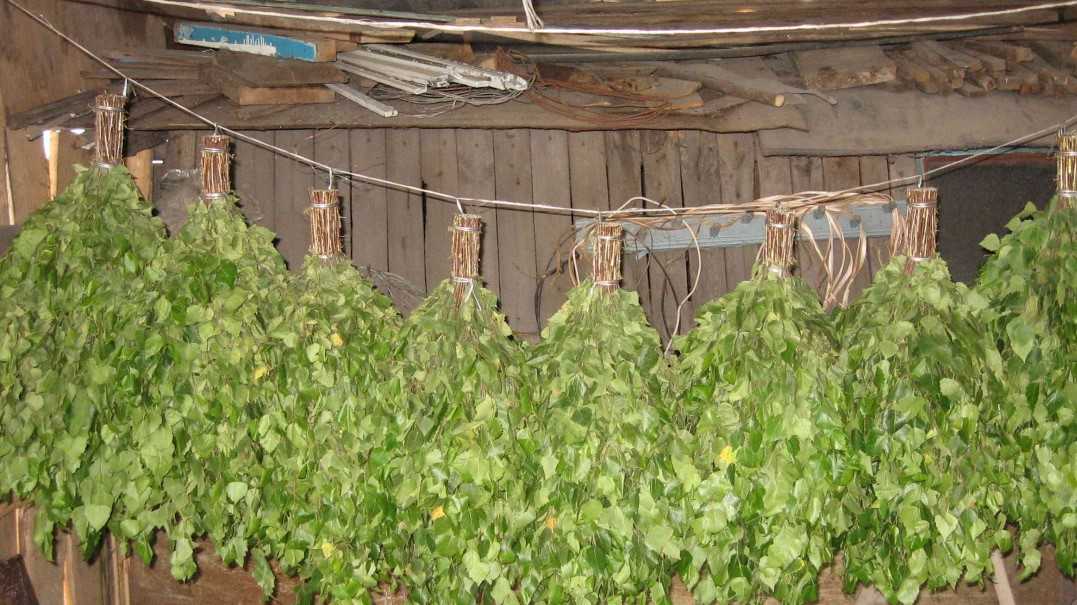 - После просушки, когда листья высохли и стали ломкими, а ветки также потеряли достаточное количество влаги, веники убирают на хранение в сухое помещение с хорошей вентиляцией.