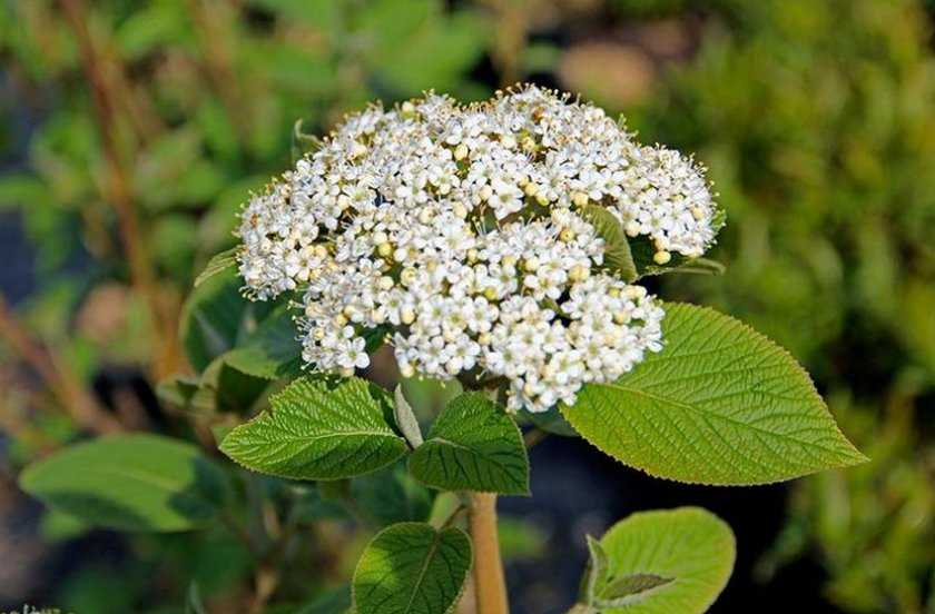 Зацвести калина может в основном в мае-июне. Продолжительность цветения до 3 недель. Цветки белые, собранные в щитковидные соцветия. Краевые цветки соцветия используются для привлечения насекомых, поэтому бесплодны, а плоды завязываются на более мелких серединных цветках.