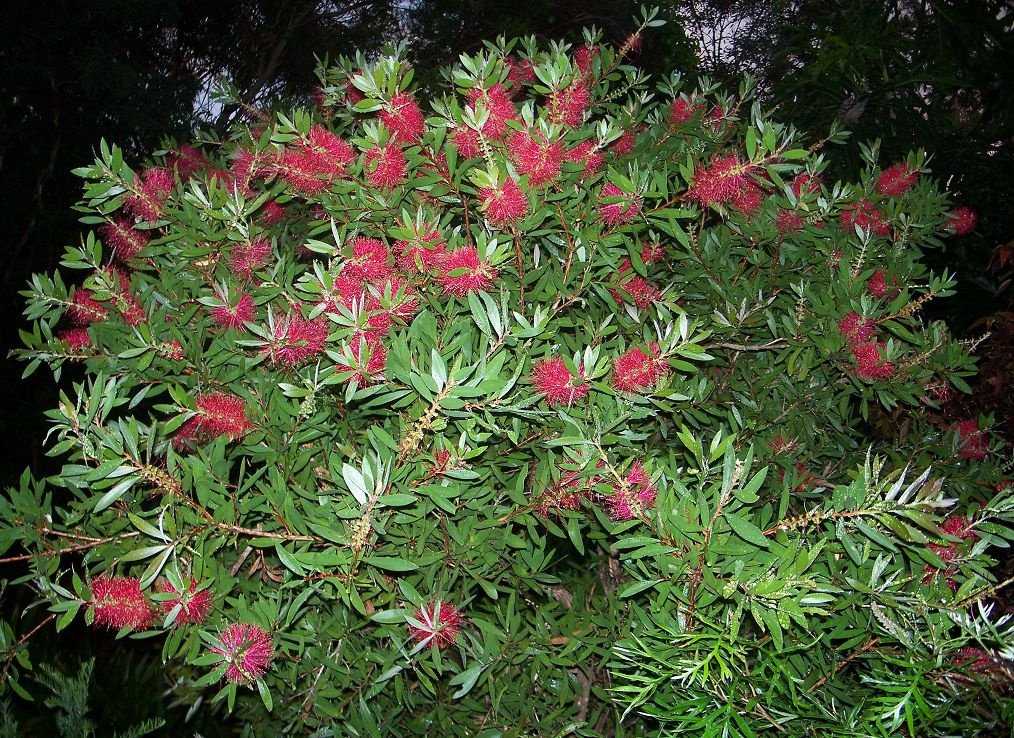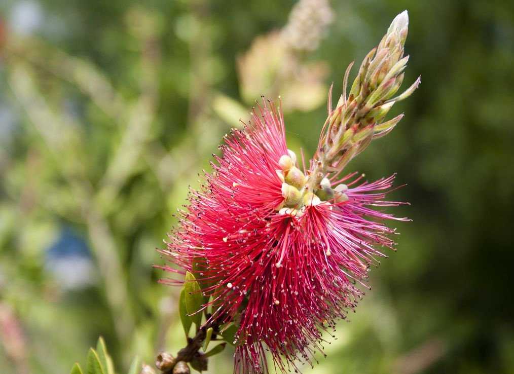 Ярко-красный каллистемон тоже родом из Южной Австралии. Рост этого кустарника может превышать 4 метра, его листы вырастают до 7 см, а соцветия – до 9 см. Тычинки каллистемона красные, а пыльники имеют желтый цвет, что придает растению золотистый оттенок.