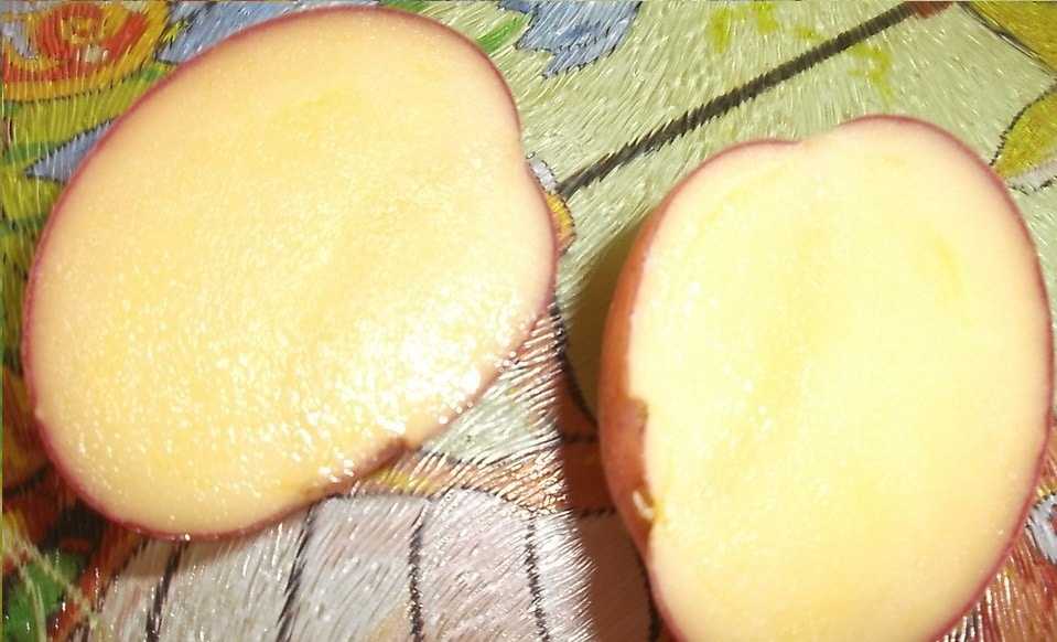 Внутри клубень такого же желтого цвета, причем окрашен более интенсивно, чем снаружи. Вкус его – ярко выраженный картофельный с маслянистым привкусом. Содержание крахмала составляет до 18 процентов, что довольно хороший показатель, по сравнению с другими распространенными сегодня сортами. Для сравнения, сорт Шери имеет процент крахмала от 10 до 12. Однако это не самый крахмалистый сорт, если сравнивать, к примеру, с сортом Свитанок.