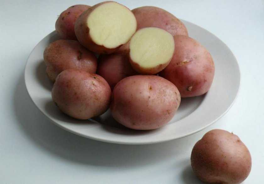 Клубни формируются в основной своей массе округлой, правильной формы с нежно-розовой кожурой и мелкими, неглубокими, красноватого цвета глазками, имеющими до семи почек. Сорт практически рекордсмен по количеству крахмала в мякоти, которая очень сильно разваривается при варке, но вкусовые качества сохраняет просто отменные. Сорт прекрасно подходит для приготовления пышного и вкусного картофельного пюре.