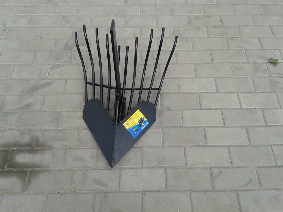Такой вариант устройства предназначен специально для использования с мотоблоками. Стрельчатые картофелекопалки очень простые, что обуславливает определенные минусы. Самым большим недостатком такого устройства является низкая производительность. С использованием такого устройства в среднем получается поднять наверх только 85% урожая.