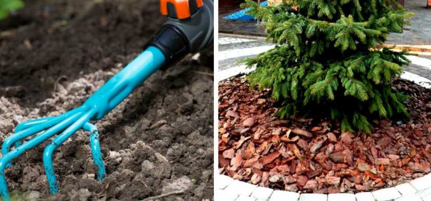 Чтобы обеспечить хвойнику полноценное развитие, осуществляют рыхление и мульчирование грунта. Приствольный круг ели укрывают толстым 20-сантиметровым слоем мульчи, в качестве которой используют торф, рыхлый компост или сосновую кору. Подобная процедура позволяет сохранить в грунте влагу, реже проводить поливы и защитить корневые отростки молодого растения от замерзания в зимнее время.
