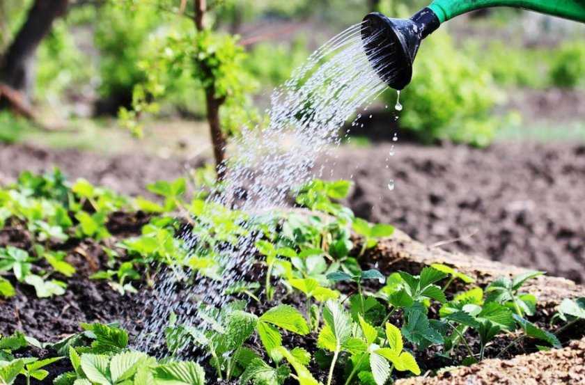 Поливать клубничные кустики нужно раз в 1-2 недели, в зависимости от количества выпадения естественных осадков в регионе выращивания. Под кустик вносят по 1 л воды.