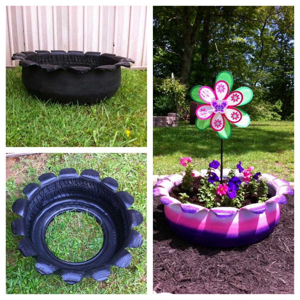 Еще один интересный мастер-класс, который полезно будет привести, посвящен изготовлению стильной садовой вазы из изношенного колеса. Для работы нужно подготовить шину, у которой сохранились диск, нож и маркер. Далее действуют по следующей схеме: