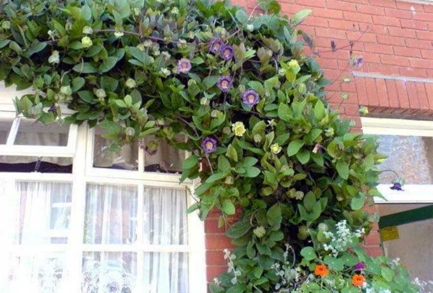 Быстрорастущее ползучее растение с зелеными крупными листьями и крупными же фиолетовыми цветами кобея чаще всего применяется цветоводами для создания зеленых беседок, укрытия зеленью стен, веранд и других сооружений.