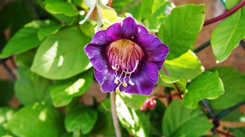 Особенно красиво смотрится кобея, когда зацветает. Окрас ее крупных цветков-колокольчиков – ярко фиолетовый. Еще они бывают винно-белого оттенка. Цветение происходит в начале июля и может длиться до первых осенних заморозков. С наступлением холодов цветок просто вырывают из земли вместе с корнями или переносят в домашние вазоны.