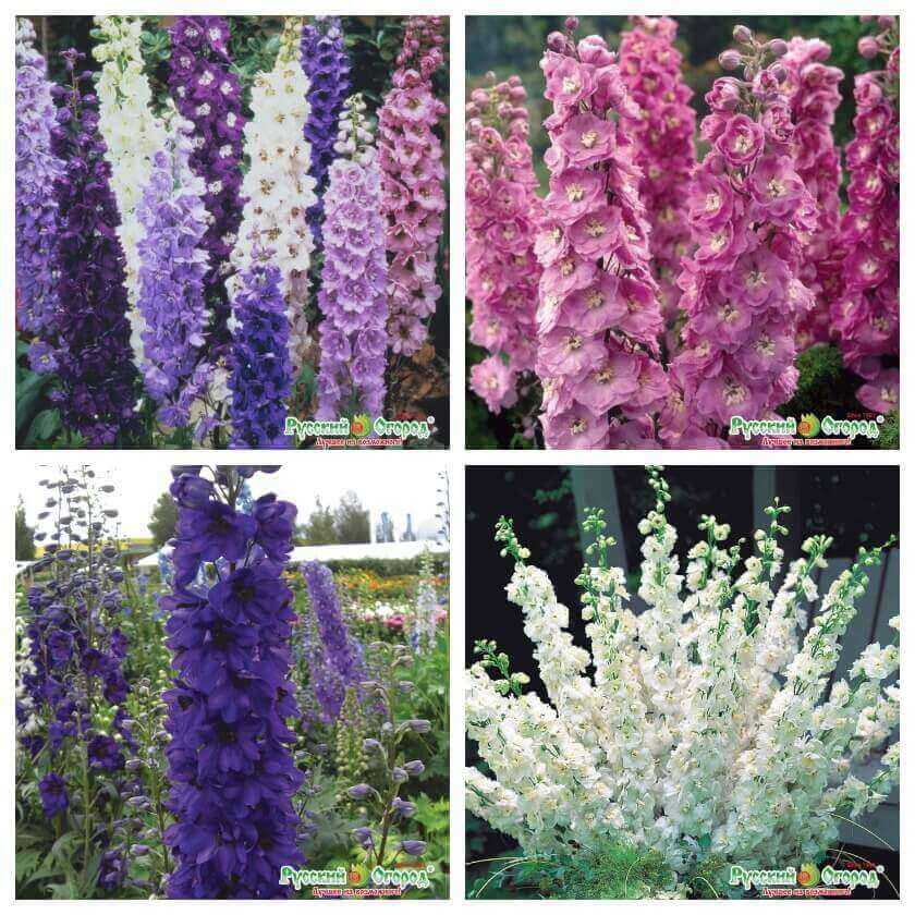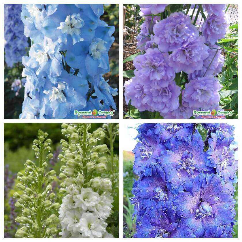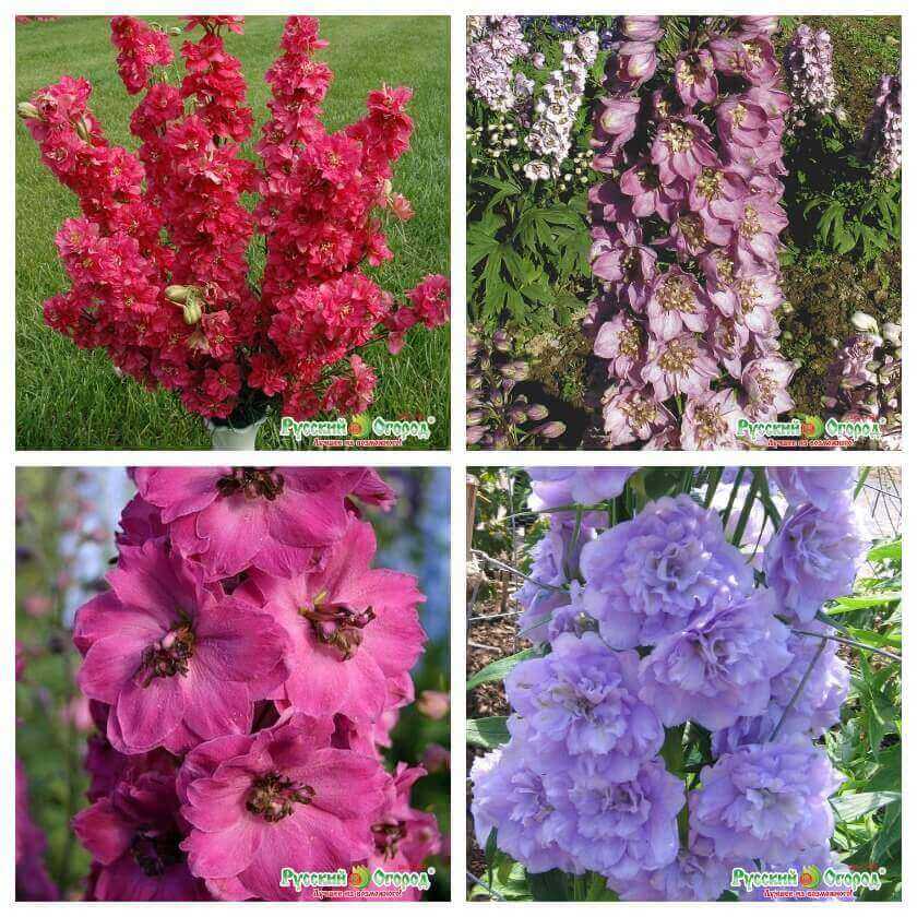 В интернете продаётся большое количество семян различных сортов дельфиниума, в том числе так называемый дельфиниум новозеландский. Смотрите фото сортовых растений, взятых из интернета — дельфиниум белый, розовый, голубой, фиолетовый, махровый и полумахровый. Очень красивые цветы!