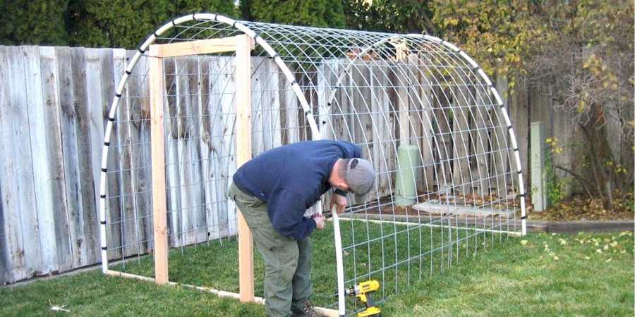 Наиболее простой и быстрый способ сделать шпалеру — приобрести готовую сетку из ПВХ в садоводческом магазине и закрепить ее на установленный каркас.