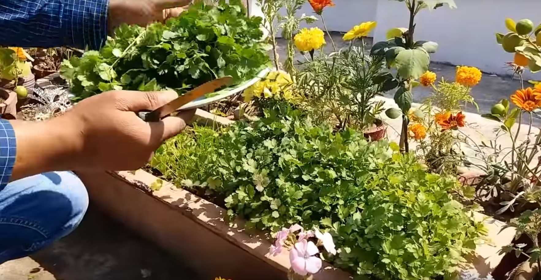 Срезать листья с кориандра желательно непосредственно перед употреблением. Это можно начинать делать после того, как на растении появится 5-6 листиков. Во время цветения стебли утолщаются и качество зелени ухудшается, поэтому если нет цели вырастить семена, цветоносы лучше сразу удалять.