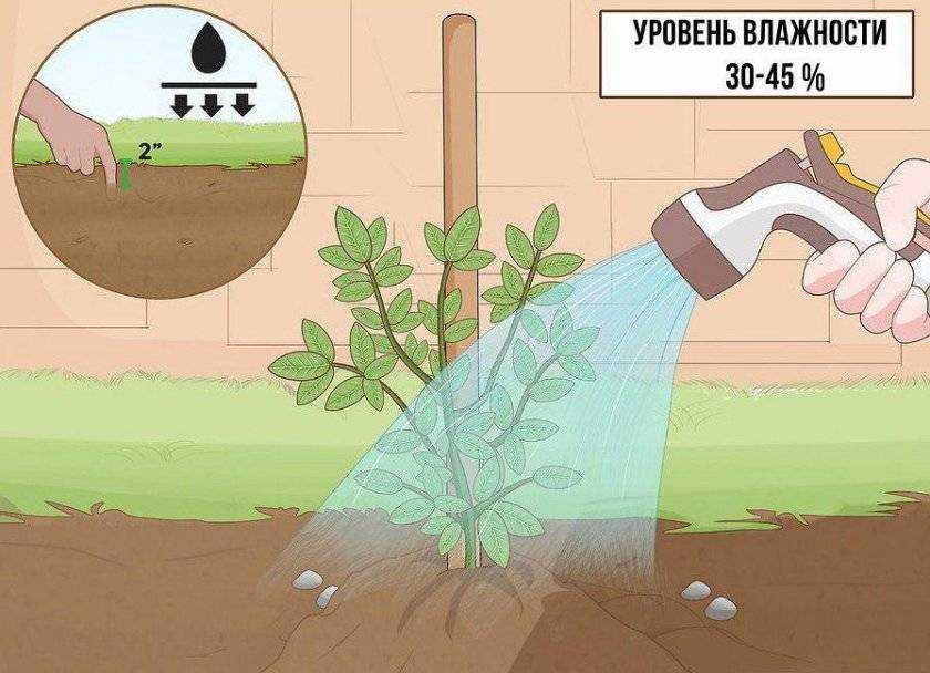Корни аккуратно распределяют по дну посадочной ямы, слегка вдавливая их в землю. Саженец необходимо разместить так, чтобы его корневая шейка шла вровень с землёй или опускалась в грунт не более чем на 3 см. Глубокое залегание может привести к развитию гнили. Яму засыпают грунтом, слегка трамбуют и обильно поливают водой. Температура воды должна быть не ниже температуры воздуха, а лучше – на 5°С выше. Под каждый куст нужно вылить не менее 3 вёдер воды.
