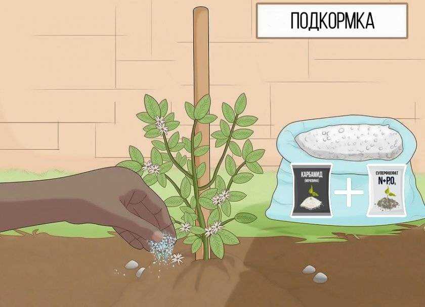 Первый раз удобрения вносят через год после высадки растения в грунт. Далее кустарнику необходима регулярная подкормка минералами. Опытные садоводы рекомендуют смешивать питательный раствор, добавляя на каждый литра воды около 5 г суперфосфата, а также по 2,5 г мочевины и сернистого калия.