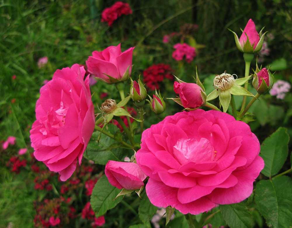 | Кустарниковые | Основное отличие — большой куст с расходящимися по сторонам побегами. Даже при минимальном уходе вырастают до 2,5–2,8 м в высоту. Среди садоводов наиболее популярны следующие сорта: Модерн Шраб, Грандифлора. В ландшафтном дизайне часто используют в качестве живых изгородей |