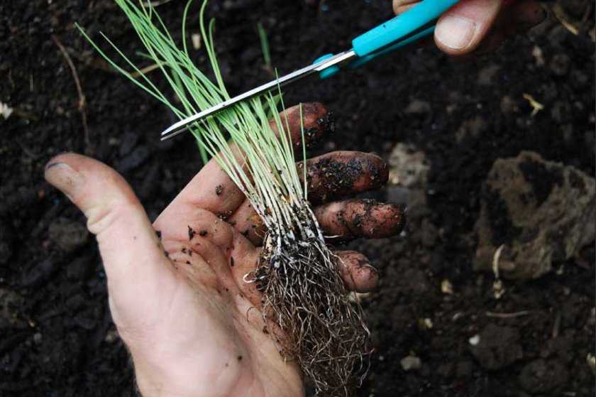 Важно! При посадке корни не должны заворачиваться к верху. Их следует аккуратно расправлять.. Чтобы рассадный материал лучше адаптировался в открытом грунте желательно срезать листья на одну треть, а также подрезать корни