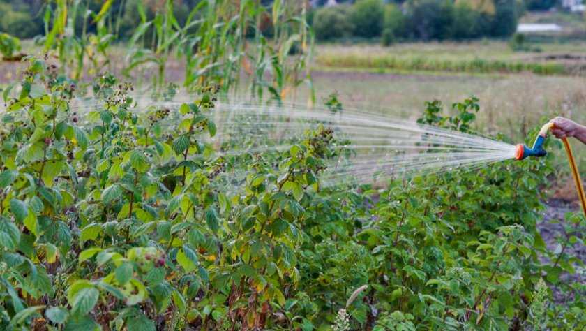 Поливать малину нужно по мере подсыхания верхнего слоя почвы, использую тёплую воду и увеличивая объёмы поливов в период активной закладки завязей. Через несколько часов после полива следует аккуратно взрыхлить грунт и удалить сорняки. Для сохранения влаги в почве можно мульчировать её скошенной травой, торфокрошкой.