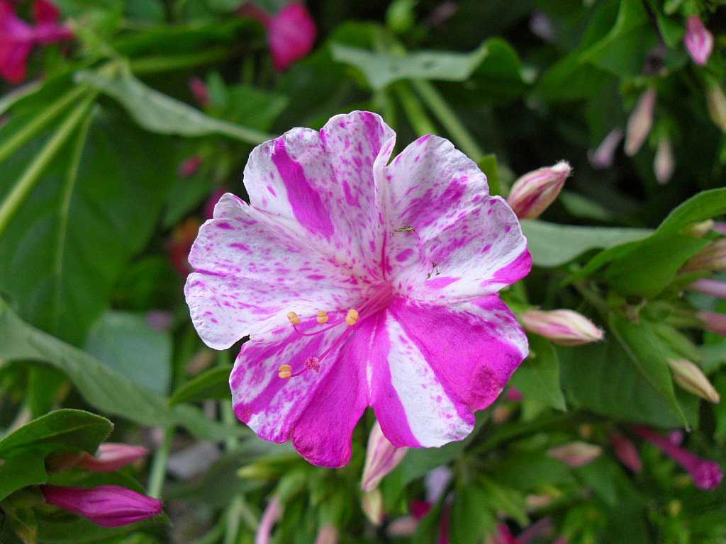 - Сорт мирабилис мраморный цветок содержит яркие цветки с темными жилками, также различных цветов, его пышное цветение длится с июля по август и замечательно смотрится в цветниках и миксбордерах;