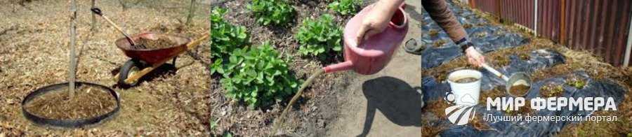 Чтобы получить хороший урожай одних поливов и борьбы с вредителями недостаточно. Важным элементом есть питание. Куриный помет содержит большое количество азота, поэтому смесь для подкормки разводят водой. Внесение готового раствора осуществляют спустя три часа после полива участка, при этом нужно быть очень осторожным, чтобы раствор не сжег листья и корни растения. Для этого настой вливают не под куст, а между рядами (рисунок 6).
