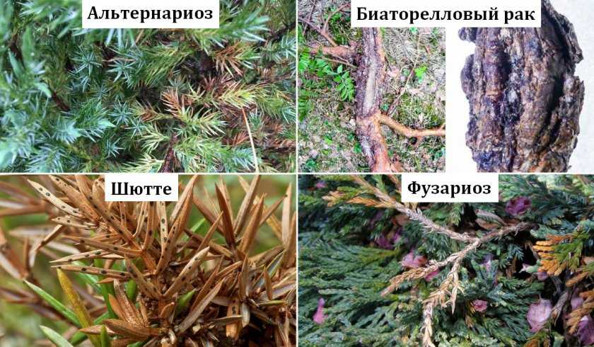Наиболее распространёнными заболеваниями можжевельника считается альтернариоз, биаторелловый рак, всевозможные инфекционные некрозы, шютте и фузариоз. Для борьбы с ними применяют любой комплексный фунгицид ( Хом , 1% медный купорос и т. д.).