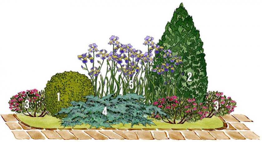 Композиция, по мнению авторитетных дизайнеров, должна создаваться следуя принципам контрастности. Хорошо выглядят растения в виде пирамиды по соседству с кустарниками в форме шара, высокорослыми или низкорослыми растениями.