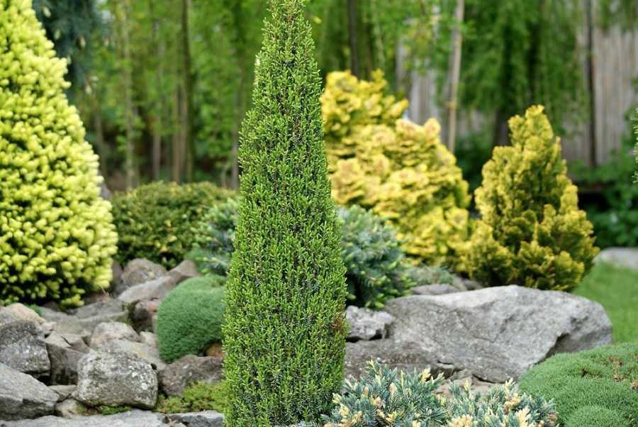 Очень высокие растения редко кто решиться использовать во внутренней композиции. Скорее они образуют живую изгородь, зонируя участок или огораживая его. Зато среднерослые хвойники пользуются заслуженной популярностью у ландшафтных дизайнеров: