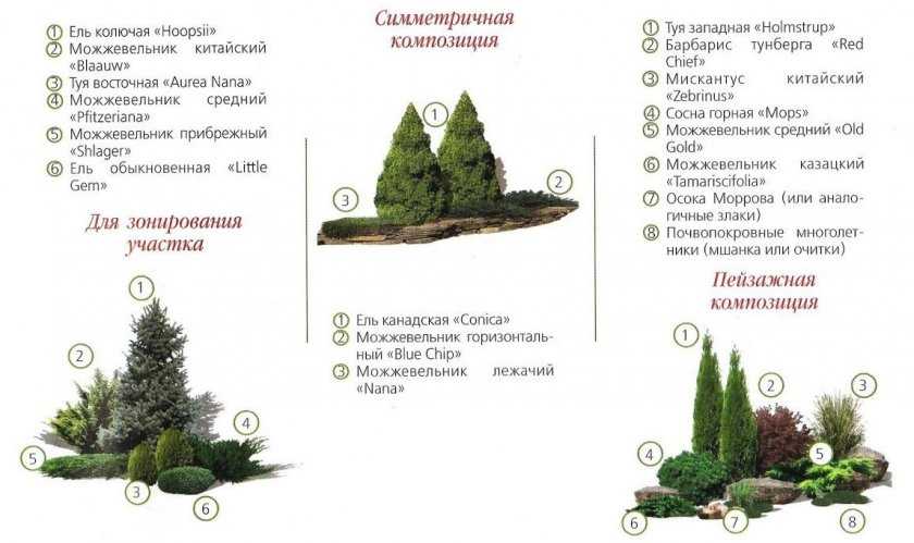 Создавая композиции, нужно учитывать не только расцветку саженца, но и его габариты во взрослом состоянии и очертания его кроны. Для того чтобы спрогнозировать вид композиции в будущем, следует, изначально изучить характеристики предлагаемых сортов, прежде чем их покупать.