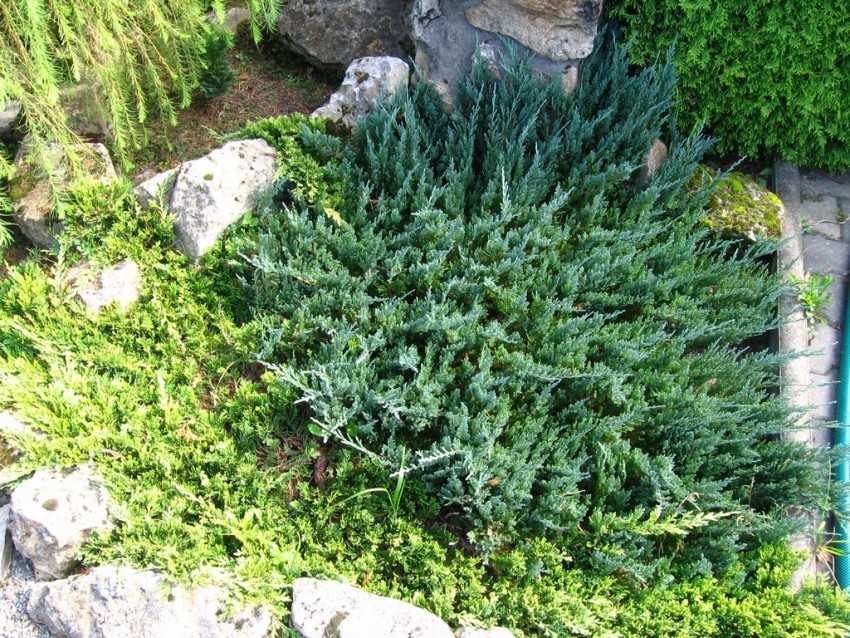 Дистанция между растениями зависит от размеров и вида можжевельника, но не должна быть менее полуметра для некрупных и не менее метра для высоких.