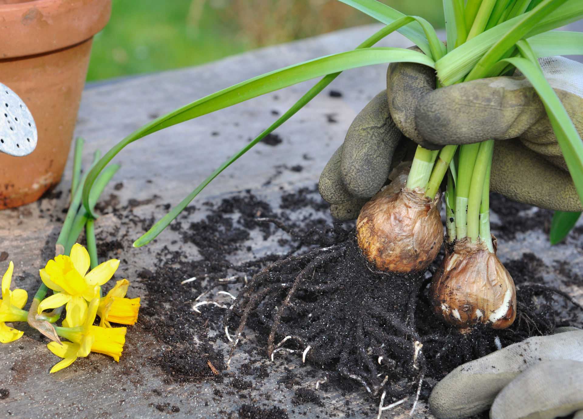 Действовать нужно крайне осторожно, чтобы не повредить луковицы и корни.