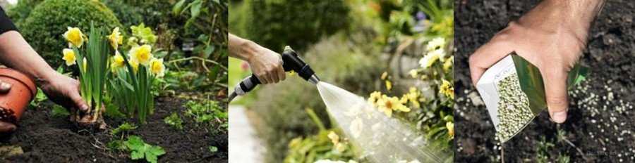 Примечание: удобрения вносят в процессе перекапывания почвы, слой питательных веществ распределяют равномерно. Удобрять землю навозом следует за год до посадки луковиц нарциссов.