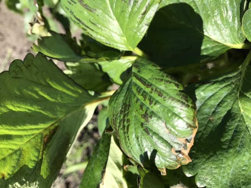 Первые признаки рамуляриоза – появление на листьях красно-бурых точек. Со временем они увеличиваются, становятся белыми посередине. Затем на их месте появляются дырки, листья перфорируются. При сильном поражении пятна сливаются, увеличиваются в размерах. Заболевание переходит на стебли. Часть листьев отмирает, растение становится подавленным, ухудшается качество ягод. Развитию грибкового заболевания способствуют: