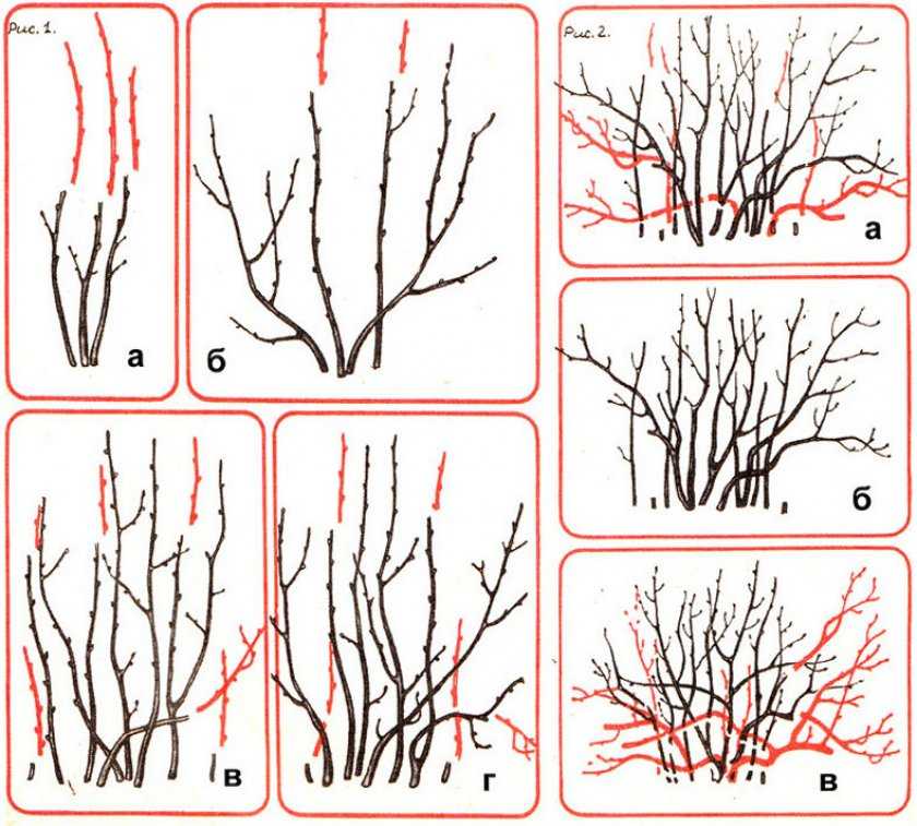 Рис.1. Обрезка смородины: а — однолетнего саженца; б — двулетнего куста; в,г — укорачивание побегов. Рис.2. Куст смородины до омолаживающей обрезки (а), после неё (б) и обрезка запущенного куста (в).