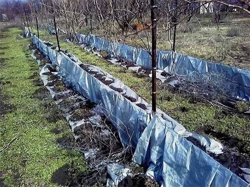 На этом этапе старый виноград укладывают на землю и укрывают.