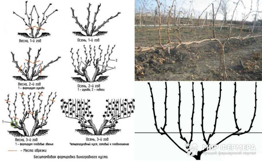 Период формирования виноградной лозы в данном случае более короткий. Он позволяет сформировать полноценный, плодоносящий куст всего за 3 года. Но есть в этой процедуре и свои тонкости, отличающие ее от предыдущего метода. Заметны эти различия на схеме обрезки винограда. Даже начинающий дачник с легкостью найдет различия в штамбовой и бесштамбовой формировке.