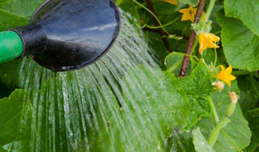 Известно, что огурец содержит около 95% воды и растение надо регулярно поливать. Полив с интервалом в 3 дня при нормальной погоде надо проводить начиная с появления на кустах первых цветков. Норма полива составляет 7–10 литров тёплой воды на куст. Поливать огурцы удобно вечером нагретой за день водой.