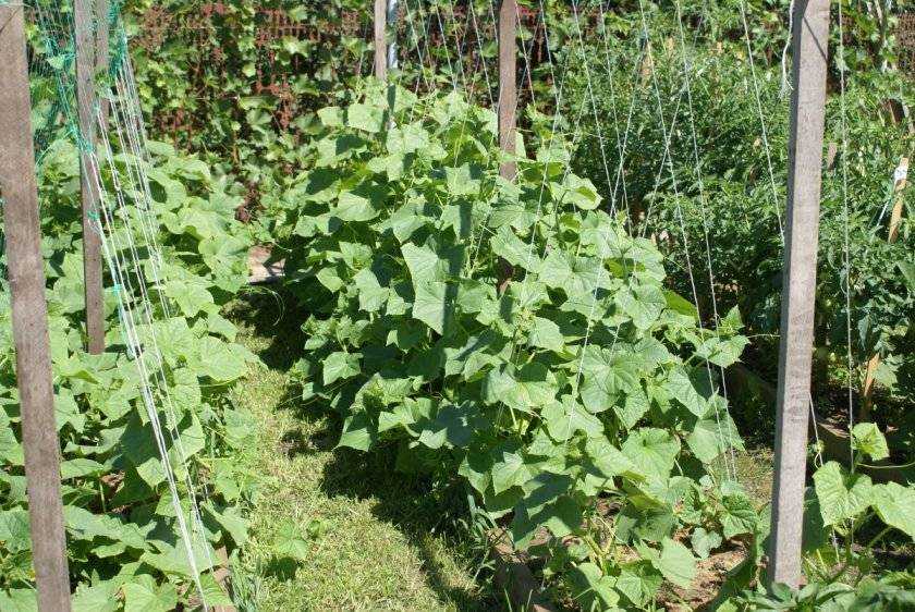 Традиционная агротехника выращивания огурцов предусматривает обязательную подвязку. Самым эффективным способом закрепления кустов считается подвязка к шпалере. Для этого над каждой грядкой закрепляют горизонтальную штангу с вертикальными опорами. Поскольку высота каждого куста не превышает 30 см, общая конструкция должна быть не выше 50 см.
