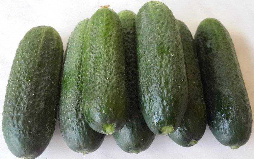 Характеристика сорта будет неполной без рассказа о поспевающих зеленцах. Спелые плоды вырастают примерно одинакового размера, их форма — овальная, длина — до 10-12 см, в диаметре — не более 5 см. Вес одного зеленца — около 110 г. кожица — средней плотности, с небольшими бугорками, расположенными равномерно по поверхности плода. Количество семян в плодах уменьшено.