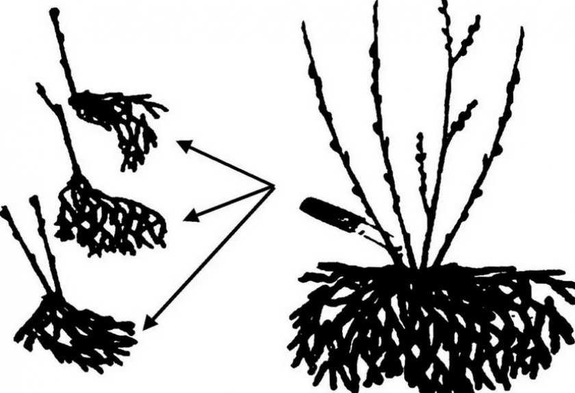 Отросток, который берётся от материнского куста, называется парциальным. Его можно использовать как вполне сформировавшийся саженец для высадки в открытый грунт. Оптимальное количество здоровых почек на побеге — не менее 5 штук. Процедура высаживания аналогична вышеописанной. Допускается пересадить парциальный побег в горшок, но его придётся оставить на зиму в помещении.