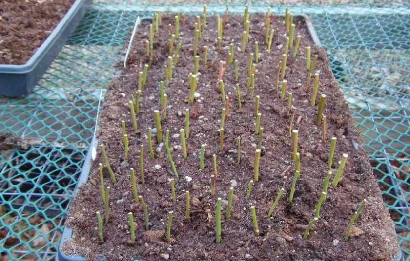 Молодые побеги, которые годны для процедуры черенкования, нарезают в начале июля. Их длина должна быть от 5 до 7 см. Полученный материал обрезается и помещается в специальный раствор, который стимулирует рост корней. Среди современных препаратов выделяют «Корневин» и «Гетероауксин». Достаточно всего одного часа пребывания черенков в таком составе.