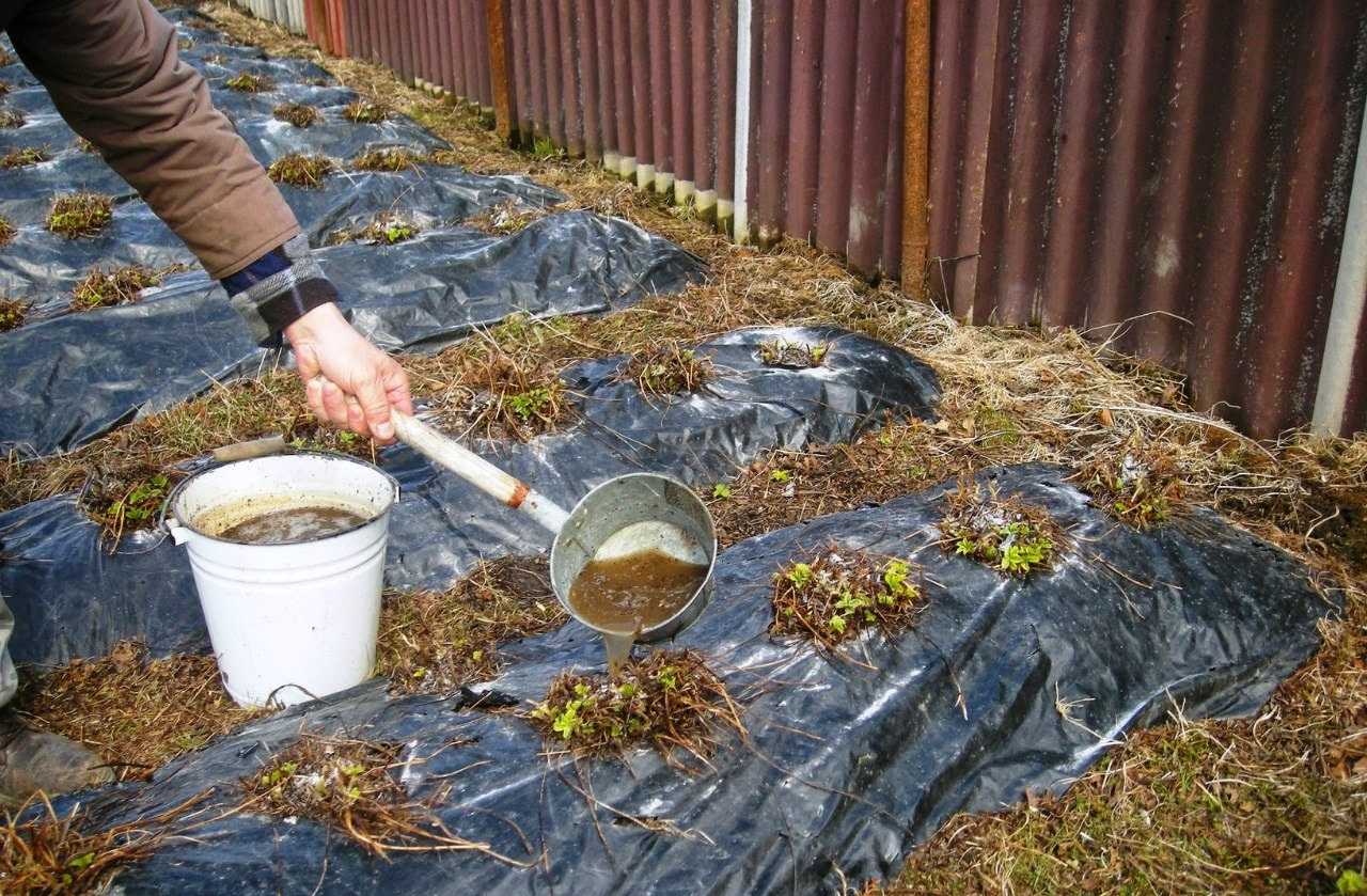 Получившуюся смесь необходимо развести водой 1:10 и напитать ею корни клубничного куста. Для каждого кустика понадобится от 500 до 1000 г.