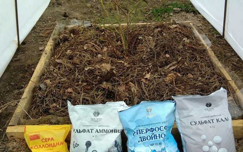 Для корневой подкормки под один куст подойдут сульфат аммония (70–90 г), сульфат калия (2 г), сернокислый магний (15 г), сульфат цинка (2 г), суперфосфат (100 г).