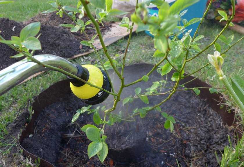 Важно! Нельзя поливать в жаркое время, когда вода сильно притягивает солнечные лучи, так как это может навредить голубике. Рекомендуется выполнять данную манипуляцию только в утреннее и вечернее время