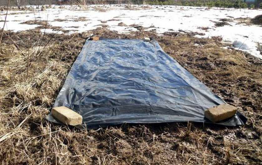 - Накрыть вскопанный участок чёрной плёнкой для лучшего прогревания почвы, сохранения её влажности и рыхлой структуры.