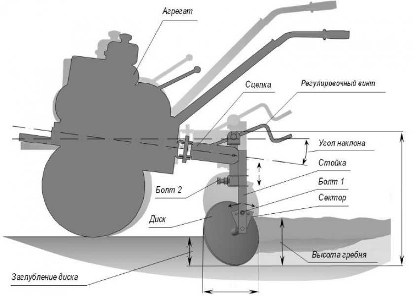 - Глубина борозды регулируется при помощи сцепки, для этого на устройстве есть специальная ручка.