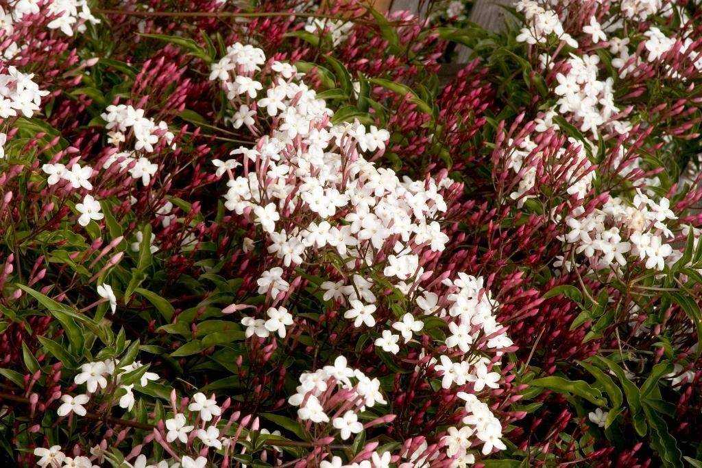 Жасмин многоцветковый или полиантовый (лат. Jasminum polyanthum). Этот кустарник можно смело назвать вьющимся жасмином, так как его ветви поникшие и сильно разрастающиеся в ширину. Высота взрослого растения составляет 1-3 метра. Листья, ветви и стебли многоцветкового жасмина покрыты тонкими волосками, которые придают кустарнику серо-зеленый оттенок. Цветки данной разновидности жасмина похожи на звездочки и собраны в гроздья. Они способны распускаться на всей длине стебля, а также на его конце. Цветет этот вид жасмина практически круглый год, распространяя приятный аромат.