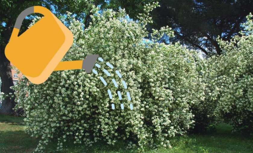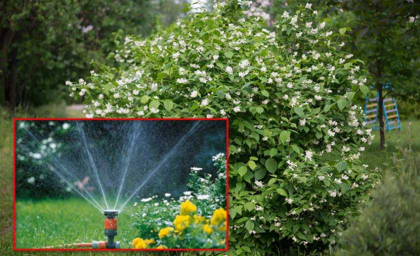 - полив – в летнюю жару молодому кусту жасмина требуется не менее 30-40 литров воды за двое суток, иначе его листья начнут быстро вянуть;