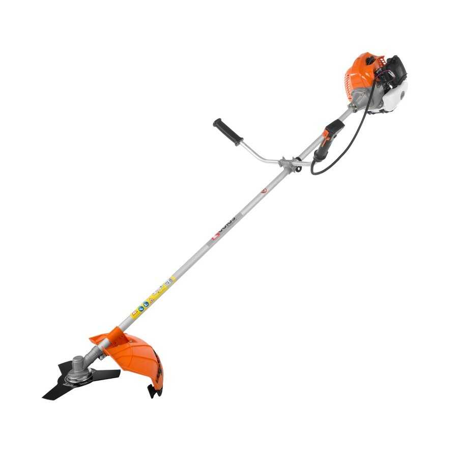 Агрегату с мощностью двигателя 5.44 л. с. под силу не только трава, но и мелкий кустарник, нетолстые деревья. Мотор располагается в верхней части конструкции, поэтому устройство безопасно при скосе влажной травы. Рукоятка велосипедного типа комфортна в использовании. Большой кожух из пластика защищает оператора от вылетающей травы.